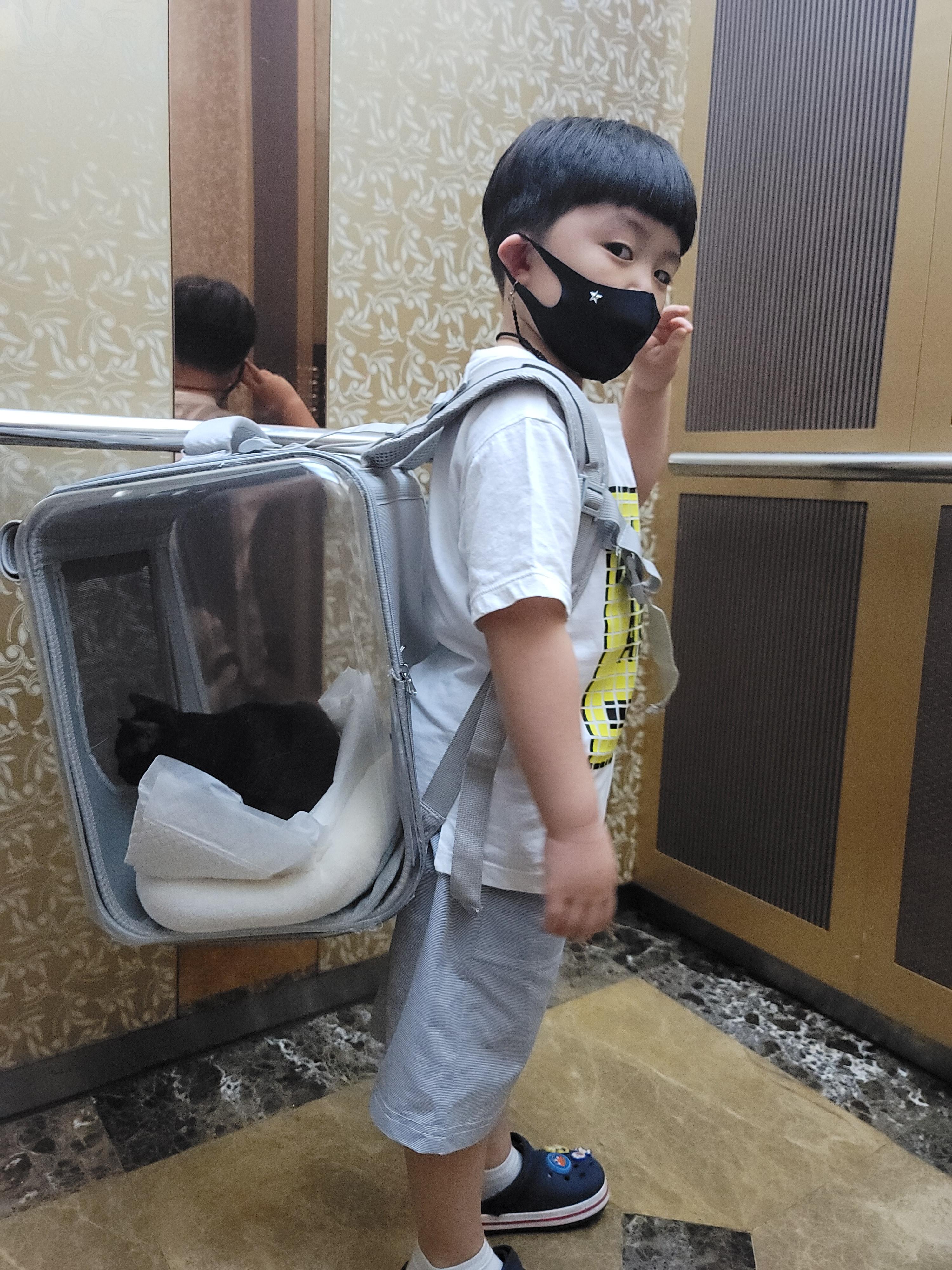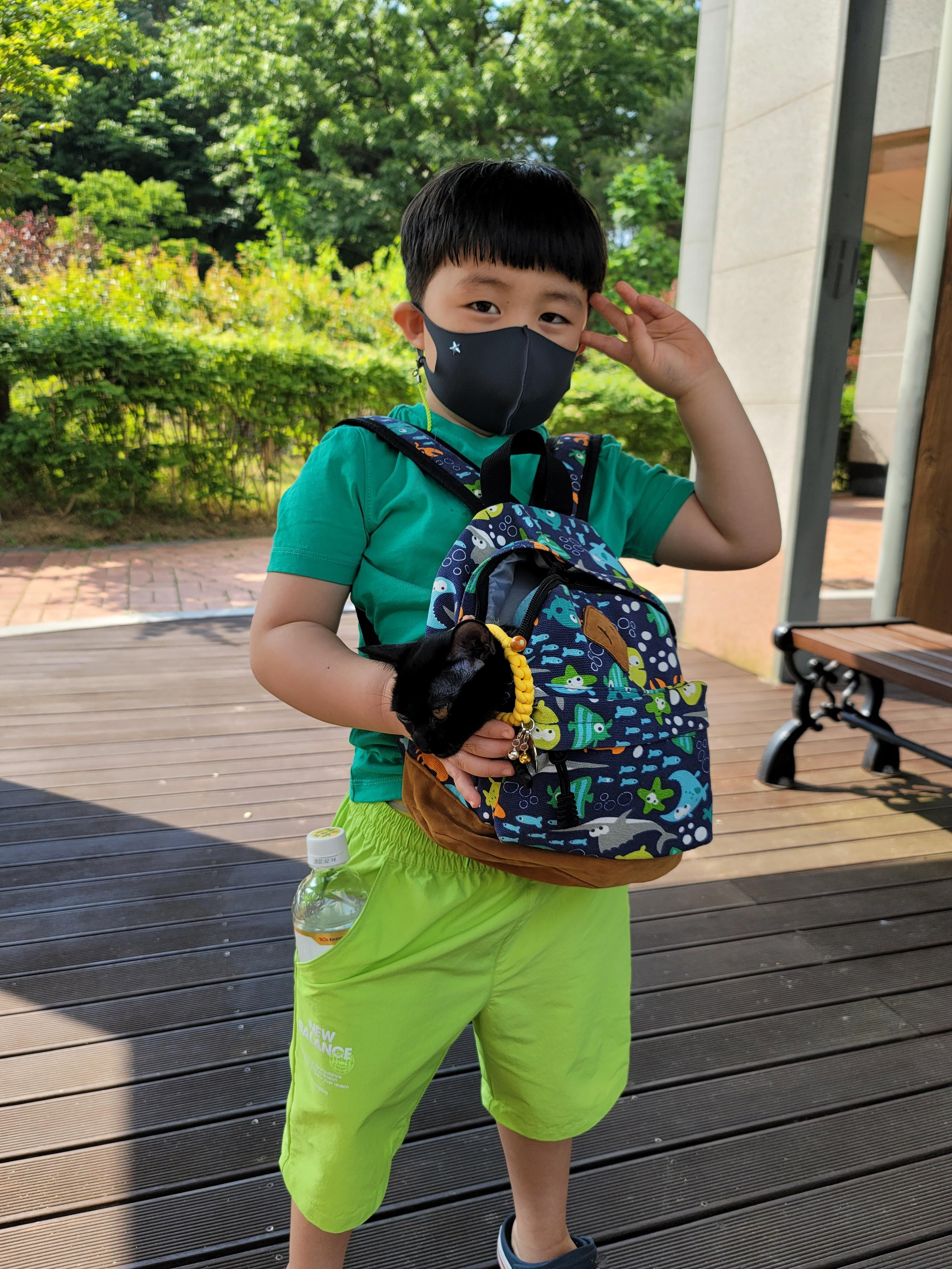 아들이 고양이를 고양이가방에 업고데리고 와서