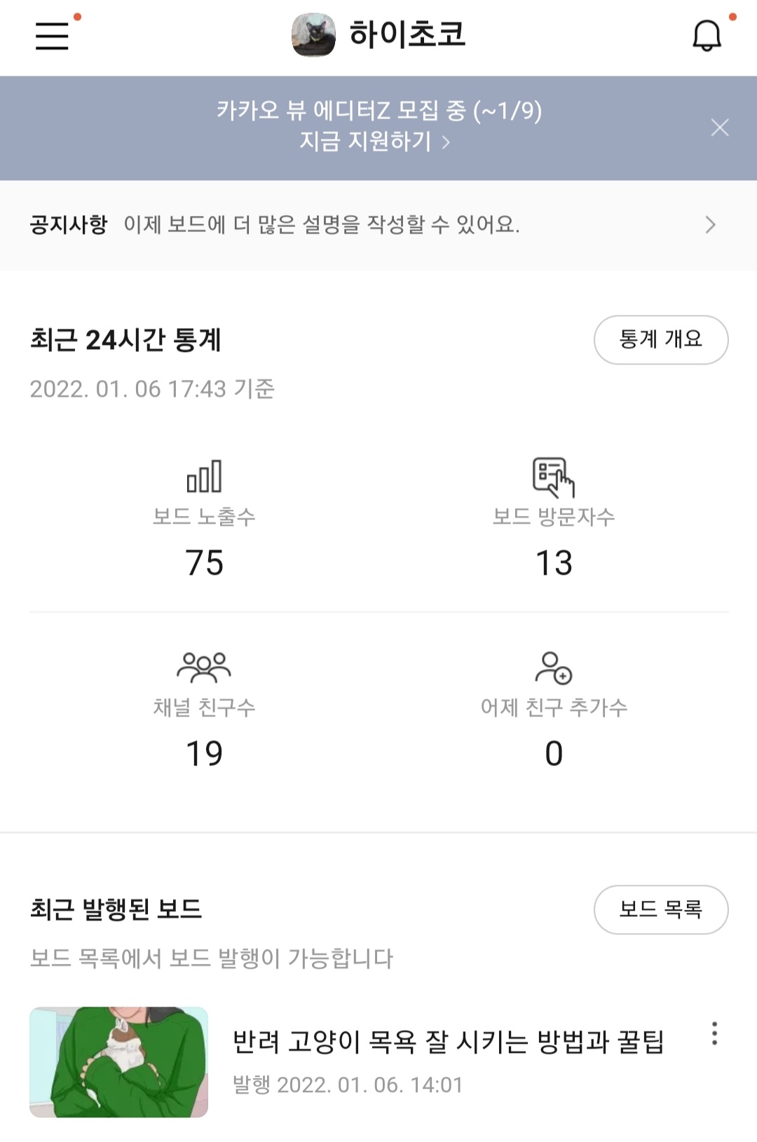 이 채널은 오늘 만들었고 보드노출수 100미만 보드방문자수 20미만이네요